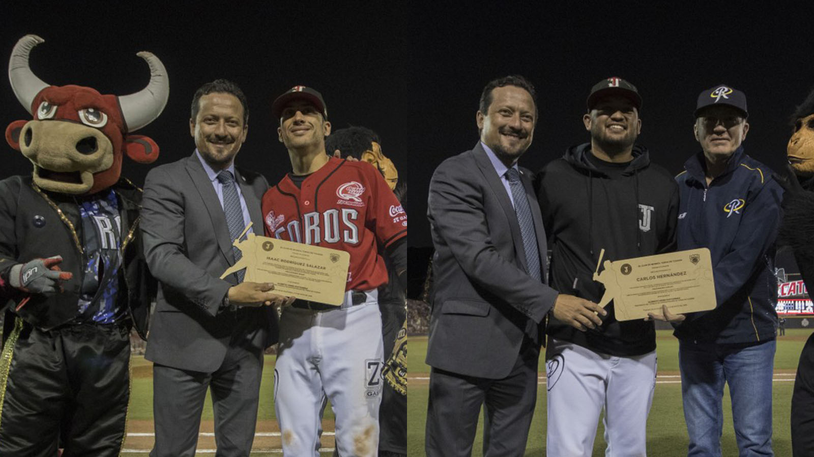 TIJUANA, Baja California (TorosDeTijuana.com-Armando Esquivel) 31 de mayo del 2018 – Isaac Rodríguez y Carlos Hernández fueron reconocidos durante el segundo juego de la serie entre Toros de Tijuana y Rieleros de Aguascalientes, por haberse consagrado como campeón de bateo y líder de triunfos de la Liga Mexicana de Beisbol (LMB), de manera respectiva.